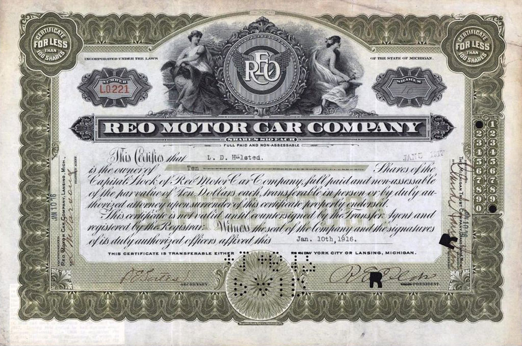 Lansing Autos Classroom - In My Merry Oldsmobile Lansing Autos Classroom - REO Advertisement, ca. 1920s Lansing Autos Classroom - Oldsmobile Truck Advertisement, ca. 1920s Lansing Autos Classroom - REO Stock Certificate Lansing Autos Classroom - REO Flying Cloud Advertisement, ca. 1920s