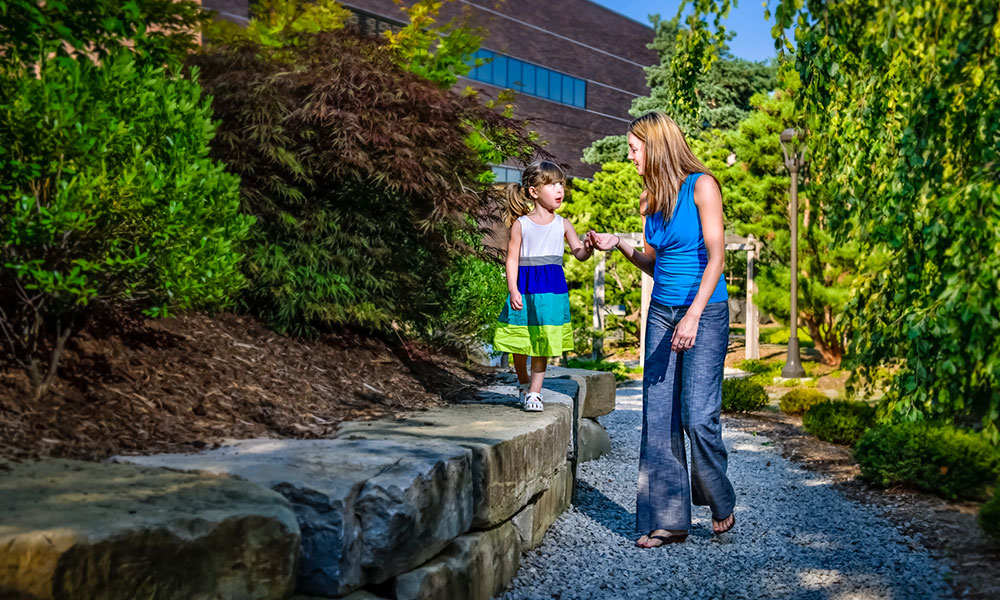 woman and child walking around in the shigematsu memorial on LCC's downtown campus