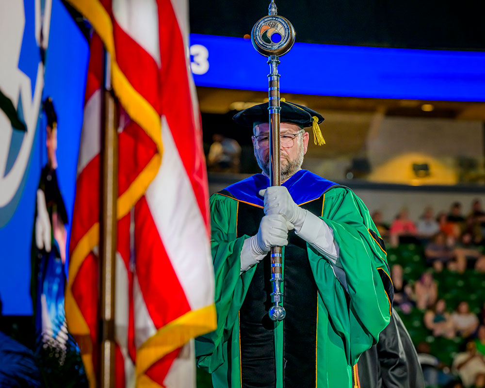 The official bearer of the College Mace at the annual Commencement ceremony is the individual selected for the current year's Experience StarPower Provost's Award. The Provost's Award is bestowed annually upon the faculty member recognized as the Faculty of the Year during our Awards Showcase.