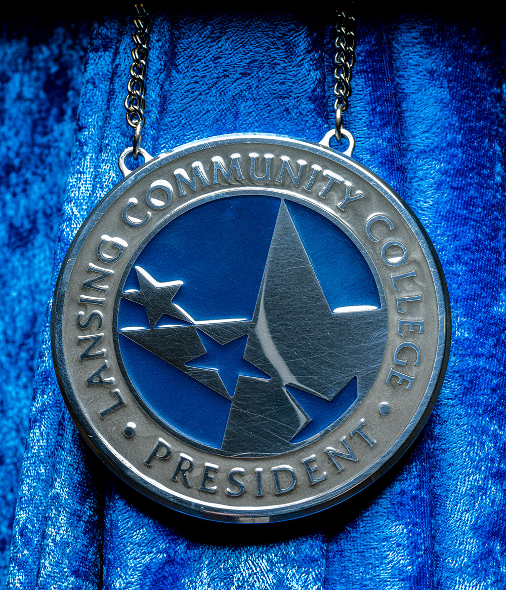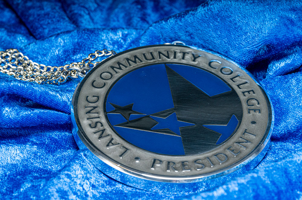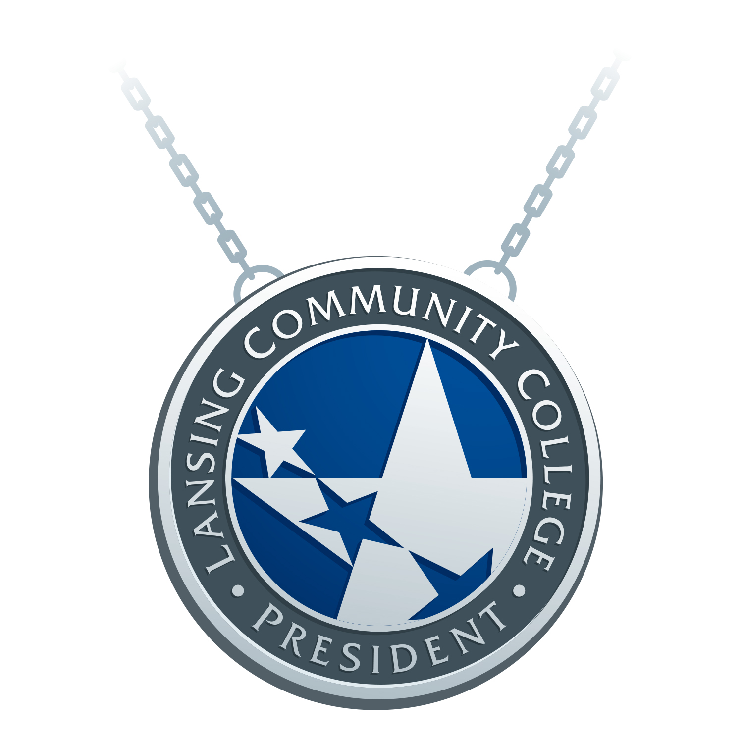 The Presidential Medallion is a symbol of office for the Lansing Community College presidency and is worn by the president at official college ceremonies. The circular medallion is forged in polished silver and hangs from a dual chain. It has the official seal of the college president on the front. The medallion was designed by Bruce Mackley, Director of Marketing and Communications and the fabrication was executed by the LCC West Campus Precision Machining team, including Todd Kotter and Brian Skogheim.